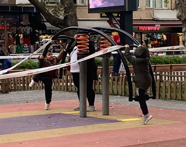 Çocuklar, belediye ekiplerinin parkın etrafını kapatmak için kullandığı şeritlere rağmen oyun oynaması görenleri şaşkına çevirdi. Annelerinin de parkta oyun oynayan çocukların yanında olması dikkatlerden kaçmadı.