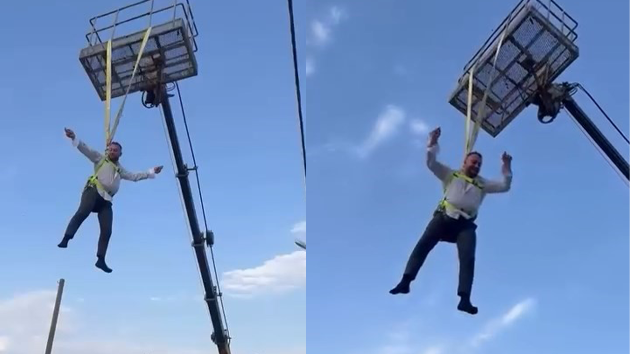Düğün öncesi yaşanan ilginç görüntüler dikkat çekti. Damat Berhan Uysal, düğün evine girmeden önce arkadaşları tarafından kiralanan vinçle havaya kaldırıldı. İpe bağlanan damat, kısa süreliğine vinçle yukarıya çekilirken, bu sırada altta toplanan arkadaşları müzik eşliğinde oynadı.