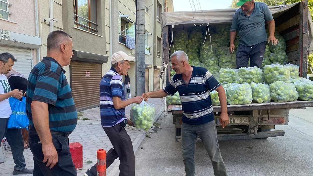 Tiryaki’nin kamyonla Ertuğrulgazi Mahallesi Selam Sokak’a getirdiği biberler poşetler halinde çevre sakinlerine dağıtıldı. Dağıtım sırasında kamyon önünde uzun kuyruklar ve yoğunluk oluştu.