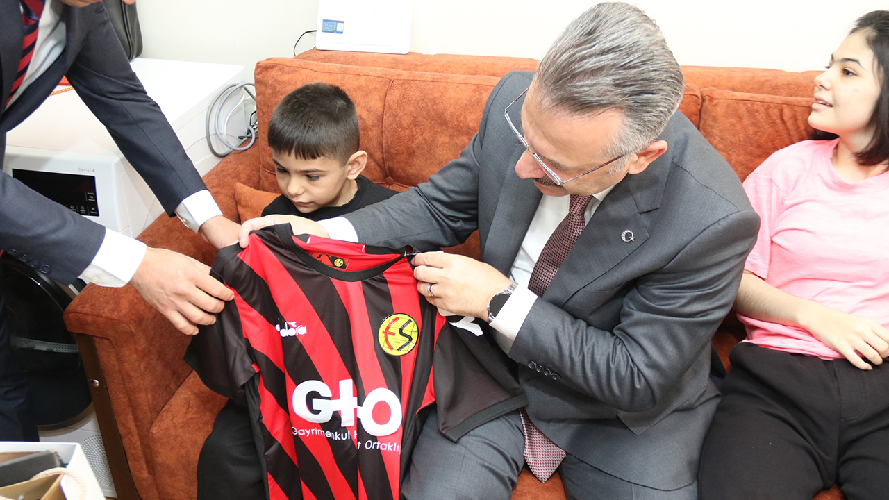 6 yaşındaki Mehmet Yıldırım, Vali Aksoy’u babasının kucağında karşılarken, “dede” diye seslenmesi sıcak ve samimi anların yaşanmasına neden oldu. Vali Aksoy, Mehmet’i kucağına alarak sohbet etti ve yanında getirdiği hediyeleri hem Mehmet’e hem de 16 yaşındaki ablası Aynur’a takdim etti.