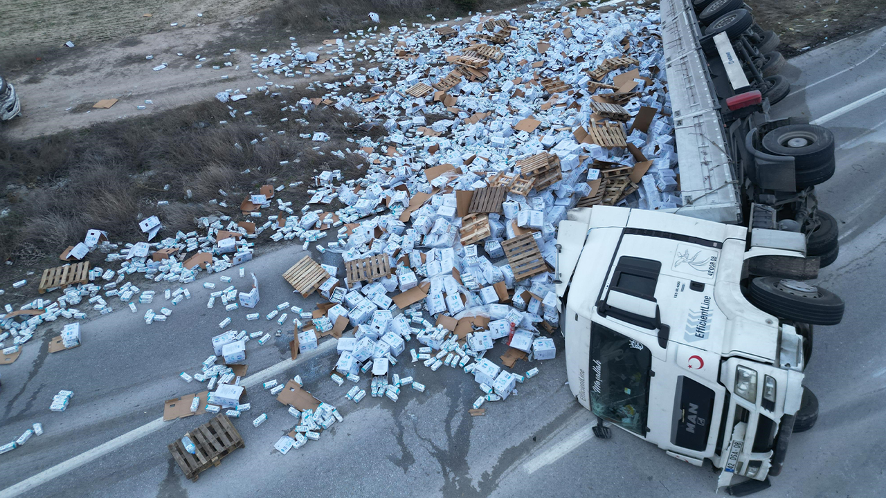 Afyonkarahisar’da kontrolden çıkarak devrilen ve yaklaşık 25 ton pastörize süt taşıyan tır nedeniyle Emirdağ-Eskişehir karayolu yaklaşık yarım saat çift yönlü olarak ulaşıma kapandı. Kazada can kaybı ya da yaralanma yaşanmadı.