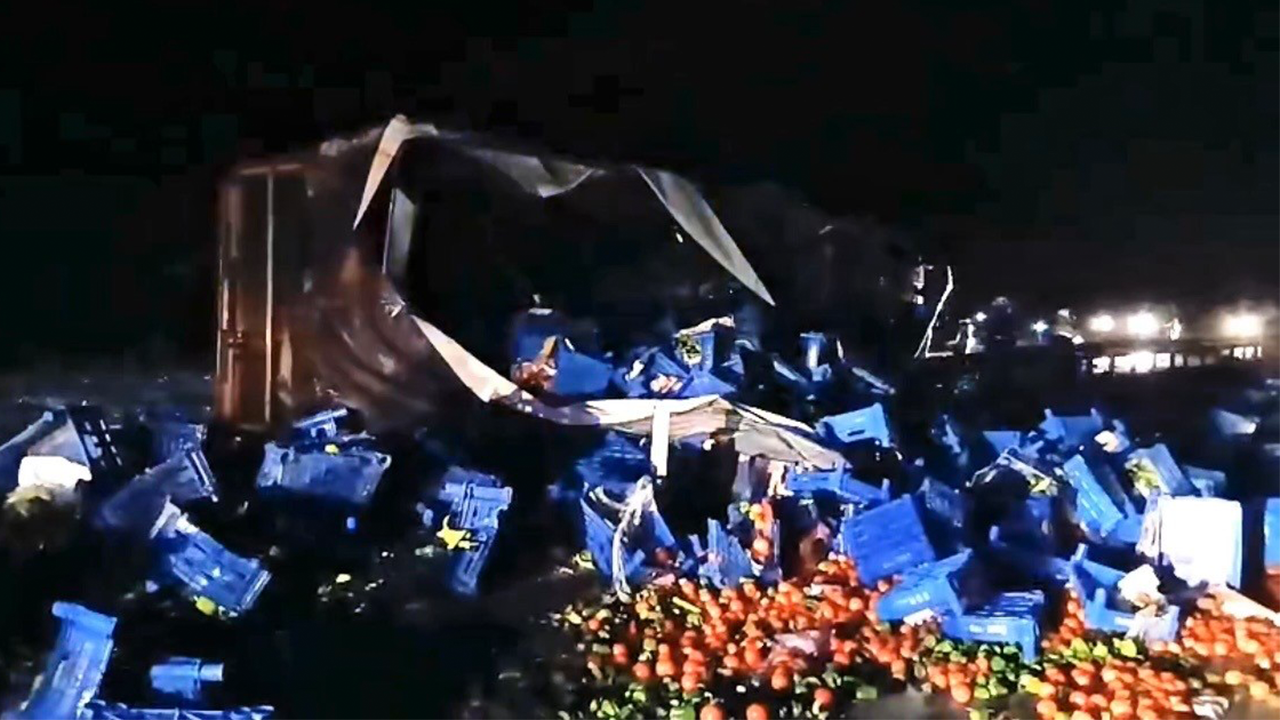 Edinilen bilgilere göre, 07 TBZ 44 plakalı tır, yağış nedeniyle sürücüsünün direksiyon hâkimiyetini kaybetmesi sonucu yan yattı. Kazanın ardından tırın dorsesinde bulunan meyveler karayoluna saçıldı.