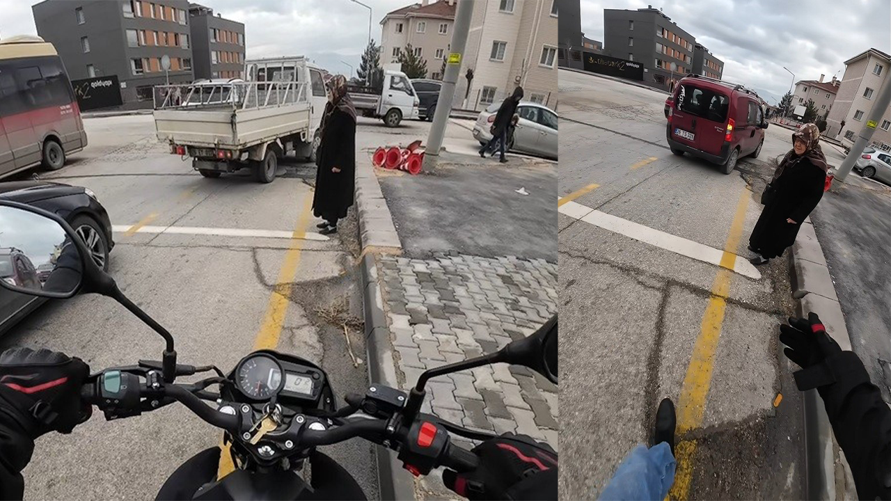 Yaşananlar, motosiklet sürücüsünün kask kamerası tarafından saniye saniye kaydedildi. Görüntülerde sürücünün motosikletini durdurması ve yaşlı kadına yolun karşısına geçene kadar eşlik etmesi yer aldı.