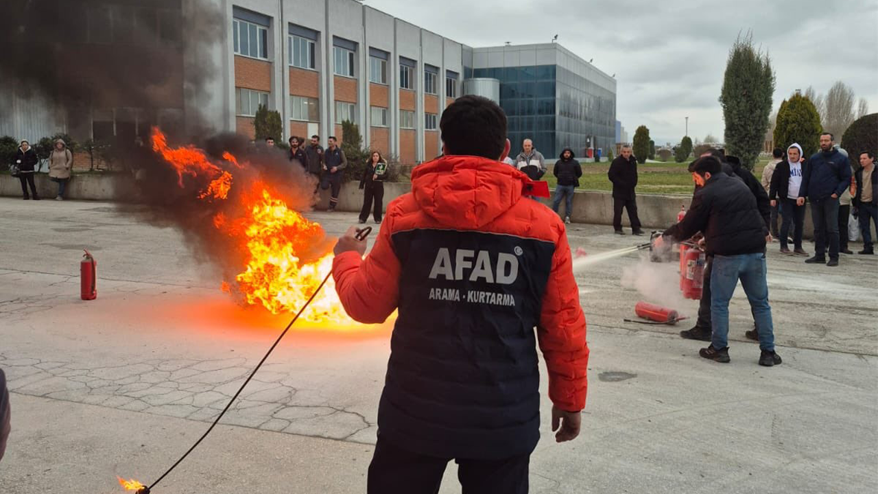 Fabrika çalışanlarına yönelik düzenlenen eğitimler, üç grup halinde gerçekleştirildi. AFAD ekipleri tarafından ilk aşamada personele afetler ve yangınlar hakkında teorik bilgilendirme yapıldı.