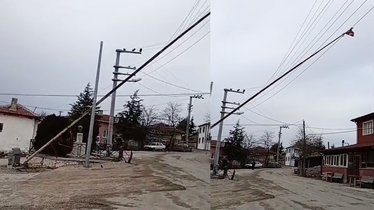 Eskişehir’in Seyitgazi ilçesinde etkili olan şiddetli rüzgar nedeniyle devrilen 30 metrelik bayrak direği, elektrik tellerinin üzerine düşerek büyük tehlike oluşturdu.