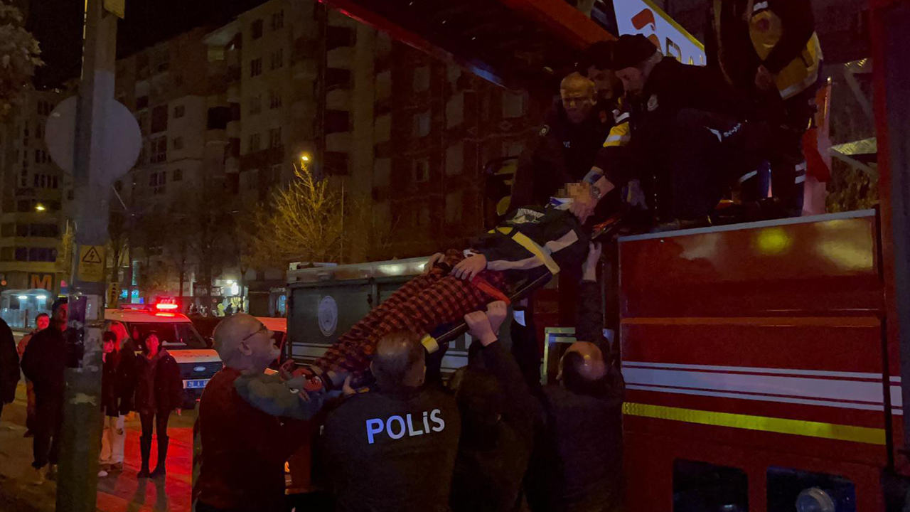 Eskişehir’de 8 katlı apartın 2’nci katından kafenin tentesine düşen ve alkollü olduğu iddia edilen 23 yaşındaki şahıs, itfaiye ekiplerinin merdivenle müdahalesi sonucu bulunduğu yerden alınarak hastaneye kaldırıldı.