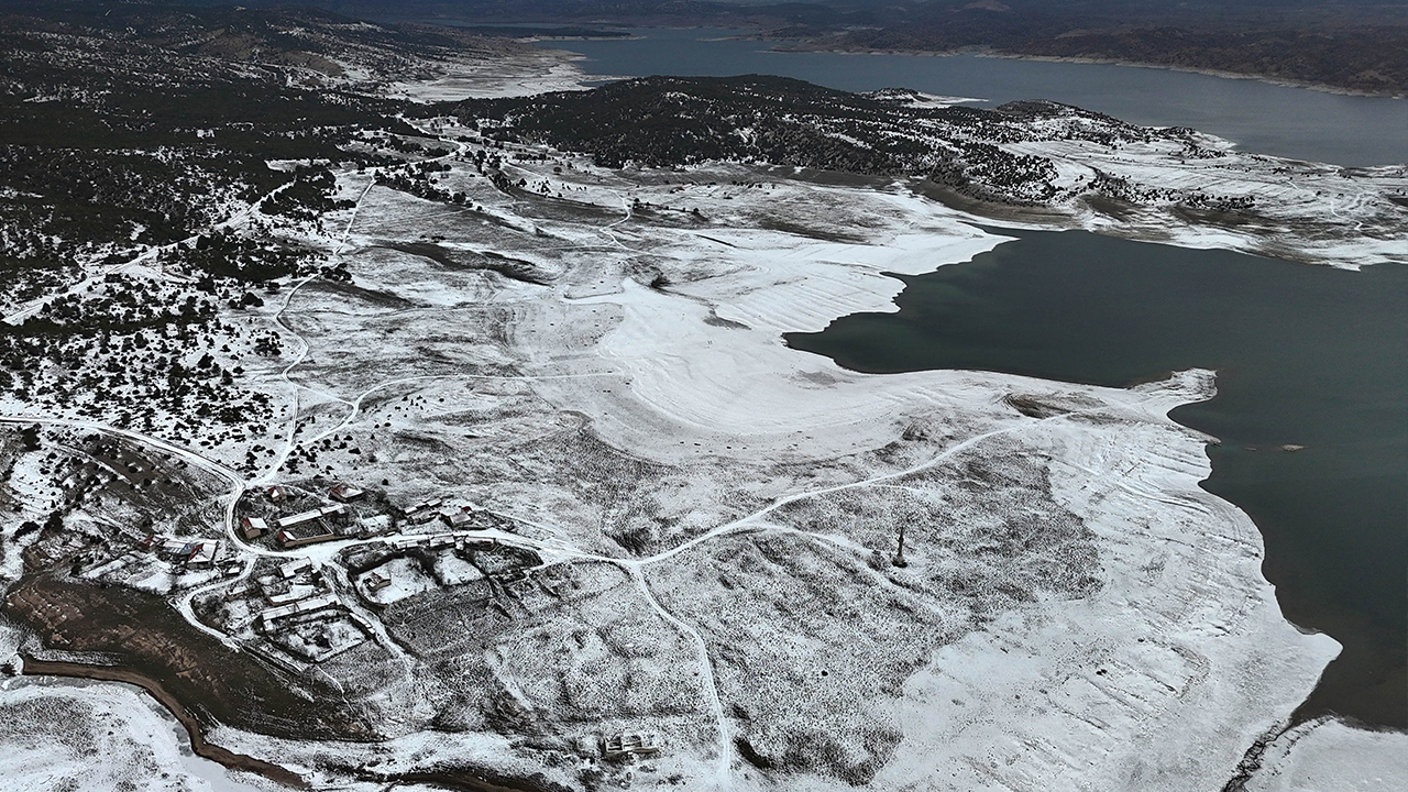 Eskişehir’in içme ve kullanma suyunu karşılayan Porsuk Barajı’nda su seviyesinin kış ayına rağmen geriye çekildiği görüldü. Barajın karla kaplı hali dronla havadan görüntülendi.