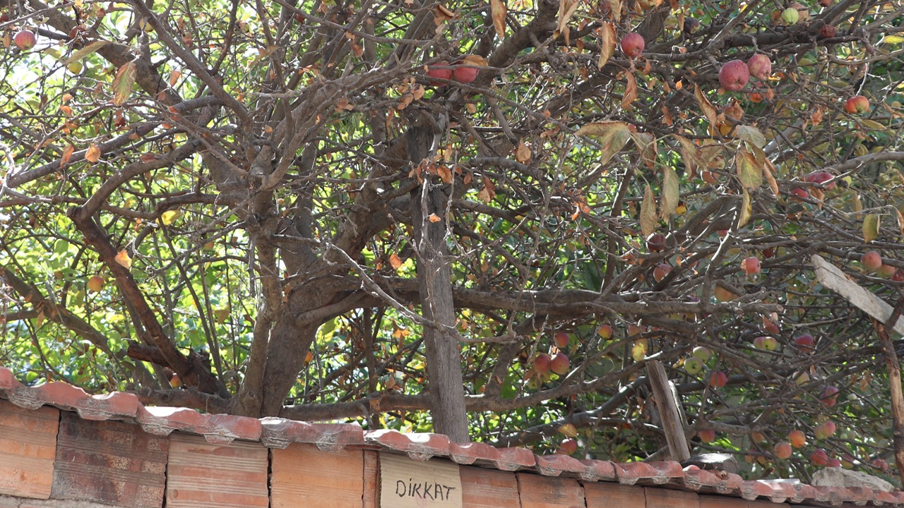 Bahçe duvarına el yazısıyla asılan tabelada, "Dikkat meyveler ilaçlı, çok zehirli" uyarısı yer alıyor. Uyarının, ağaçtan izinsiz meyve koparılmasını önlemek amacıyla konulduğu şeklinde yorumlandığı bildirildi.