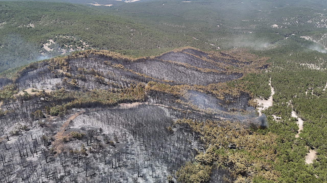 Dronla havadan kaydedilen görüntüler, ormanın ne denli zarar gördüğünü gözler önüne serdi. Kararmış toprak, yanmış ağaçlar ve dumanla kaplı alanlar, yangının bıraktığı tahribatı net şekilde ortaya koydu.