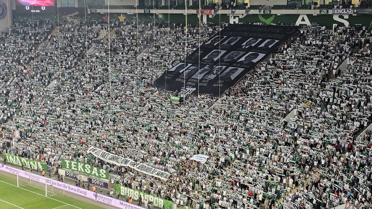 Yeşil-beyazlı taraftarlar, “Aynı ateş yaktı canımızı, aynı yürek söndürür bu yangını” yazılı pankartla hem yangın felaketine hem de ortak acıya dikkat çekti. Ayrıca tribünlerde, hayatını kaybeden şehitlerin isimleri ve fotoğraflarının yer aldığı pankartlar sergilendi.