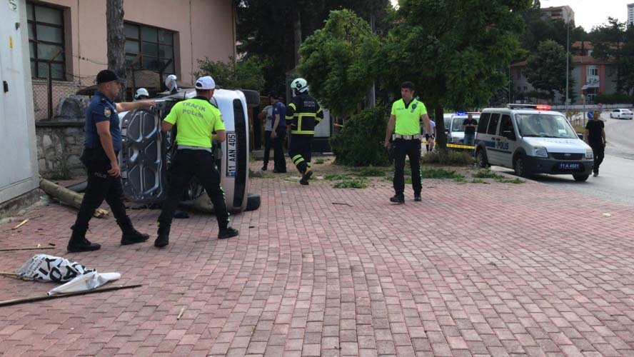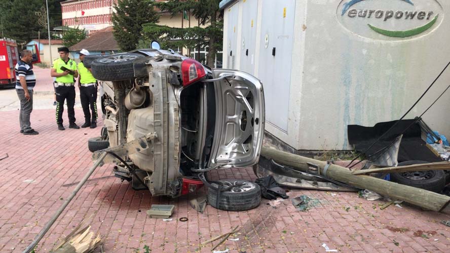 Kontrolden çıkan araç önce yol kenarında bulunan kaldırıma çarpmasının ardından elektrik direğine çarparak takla attı.