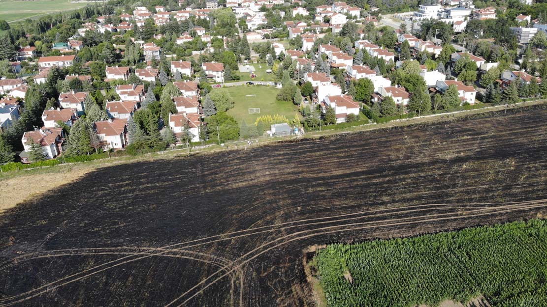 Yangın nedeniyle ekili arazideki mahsulün büyük kısmı küle döndü. Yangın sonrası tarlanın son hali dron ile havadan görüntülendi.