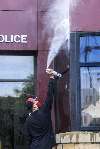 Kalabalık grup daha sonra polis memurların çalıştığı Minneapolis Polis Merkezine yürüdü. Protestocular polis araçlarına spreyle yazı yazarken binaya taş attı. Polis ise göz yaşartıcı gaz, köpük mermileri ve ses bombası ile protestoculara müdahale etti. Polis, 1 protestocunun vurulduktan sonra hafif yaralandığını bildirdi.