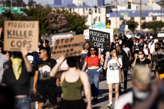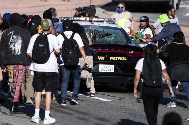 Kaliforniya eyaletinin en büyük kenti Los Angeles'taki gösteride ise bir araya gelen yüzlerce kişi, Los Angeles Belediyesi ve Polis Merkezine yürüdü. Yürüyüş sırasında Los Angeles'ın ana yollarından biri olan 101 numaralı otobanını trafiğe kapatan göstericiler, otoyolda bulunan polis aracına saldırdı. Polis, araçla bölgeden çıkmaya çalışırken aracın üzerinden düşen 1 gösterici yaralanarak hastaneye kaldırıldı. Çevrede bulunan bina ve polis merkezinin duvarlarına sprey boya ile yazı yazdı. Los Angeles polisi, şehir genelinde trafik konusunda uyarı yaparken tansiyonun daha fazla yükselmemesi için kalabalığı uzaktan yönlendirmeye çalıştı.