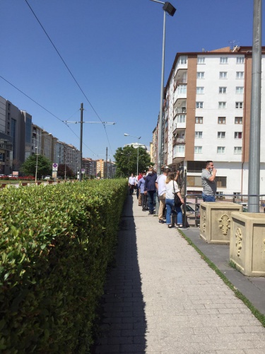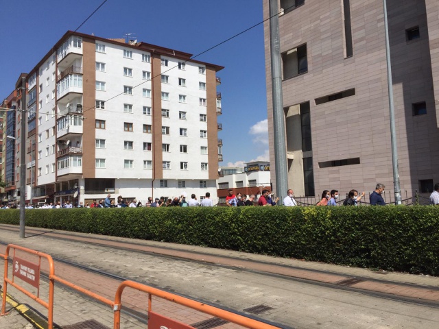 Koronavirüs tedbirlerinın Eskişehir Adliyesi'nden sıkı şekilde uygulanması tadkir topluyor, öte yandan güneşli hava altında sıcakta kuyrukta bekleyen vatandaşlar sıcak havada maskeleri ile bunaldıklarını, adliye dışına oturma yerleri ve gölgelikler konulmasının iyi olabileceğini söylüyor.