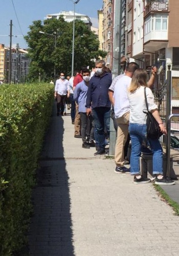 Görevliler, kuyrukta da vatandaşları sosyal mesafe ve maske kurallarına uymaları konusunda uyarıyor.