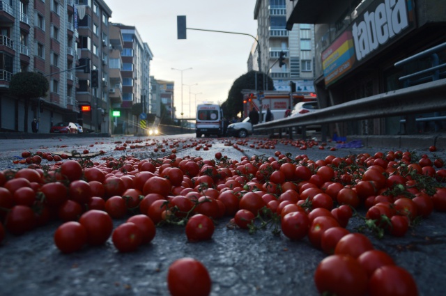 Çarpmanın etkisiyle otomobilde kasalı şekilde olan domatesler yola savruldu.