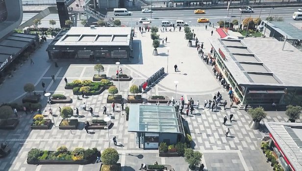 Esenyurt'ta bulunan bir alışveriş merkezi önündeki oluşan metrelerce kuyruk havadan görüntülendi.