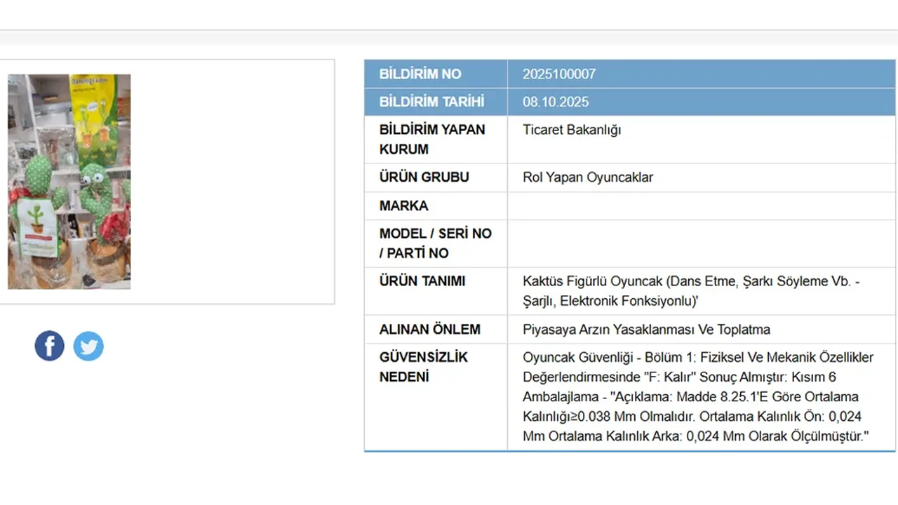 Ticaret Bakanlığı, tüketici sağlığına yönelik denetimlerini sürdürüyor. Bakanlığın son incelemelerinde, çocuklar tarafından sevilen kaktüs figürlü, şarjlı ve elektronik fonksiyonlu (dans etme, şarkı söyleme vb.) oyuncak için boğulma riski tespit edildi. Bu gerekçe ile ürün Güvensiz Ürün Bilgi Sistemi (GÜBİS)’e eklendi; üretiminin yasaklandığı ve piyasadan toplatma kararı alındığı bildirildi.