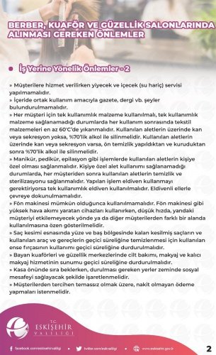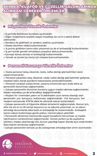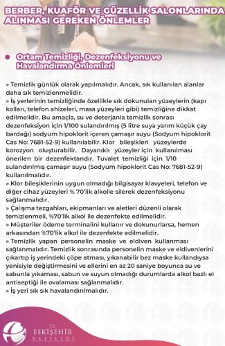 Eskişehir Valiliği, berber, kuaför ve güzellik salonlarında alınması gereken önlemler ve uygulanması gereken tedbirlerle ilgili de 4 sayfalık kurallar listesi yayınladı, vatandaşlar ve işletmeler uyarıldı...