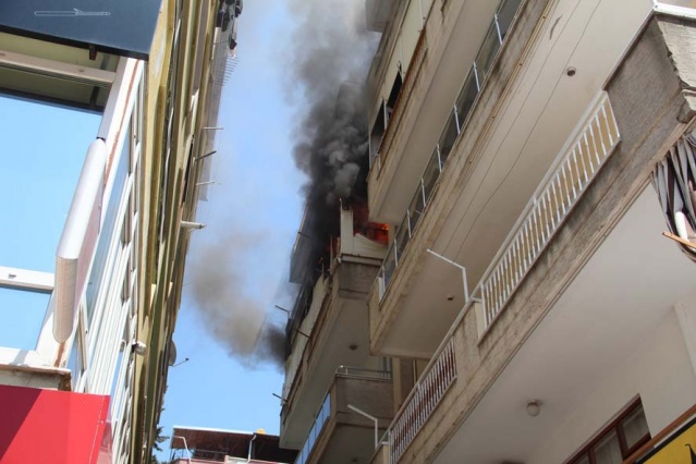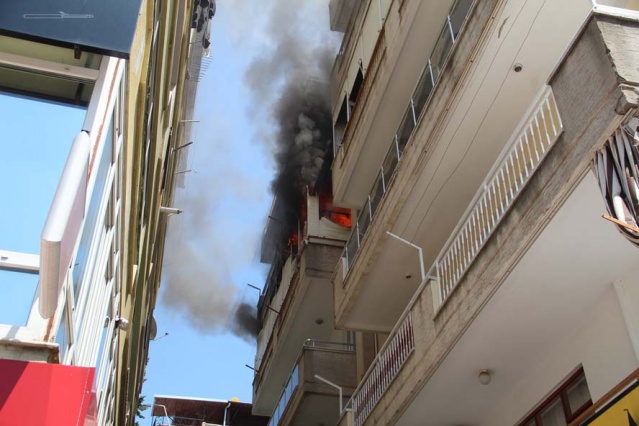 Daireden çıkan alevler nedeniyle yanan parçalar zemine düştü.