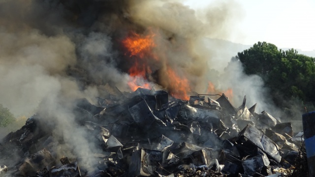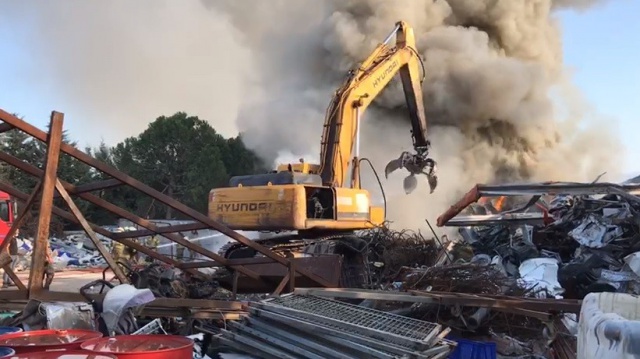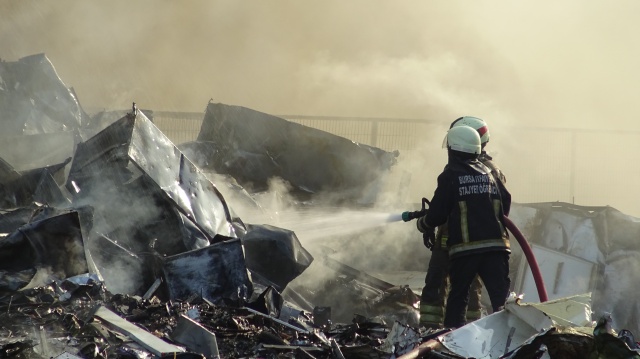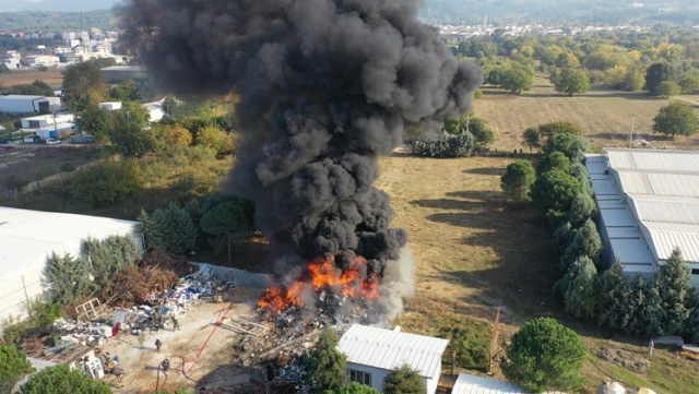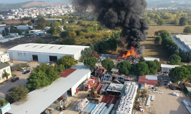Bursa'da buzdolabı hurdalarının toplandığı geri dönüşüm deposunda yangın çıktı. Alev alev yanan tesis drone ile havadan görüntülenirken, yangına 6 itfaiye aracı ile bir iş makinesi müdahale etti.