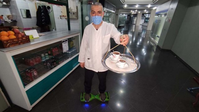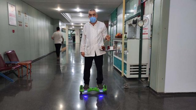 Bir arkadaşının tavsiyesi üzerine elektrikli kaykayla tanışan esnaf bu aleti kullanmayı öğrenerek artık çaylarını bununla hiç yürümeden servis etmeye başladı.