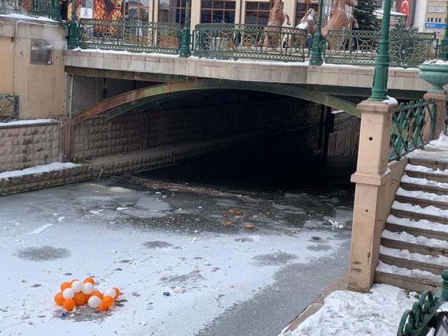 Buz tabakasıyla kaplı Porsuk çayı üzerine atılan alkol şişeleri, ekmek parçaları, ayakkabı ve benzer çöpler, Eskişehir’in en önemli sembolünün güzelliğine gölge düşürüyor.