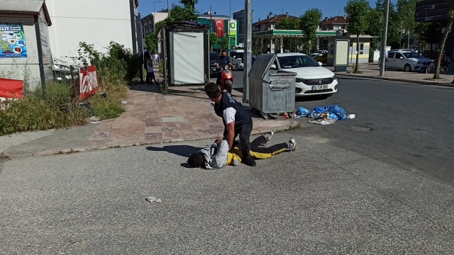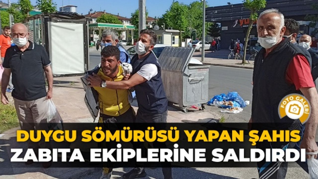 Düzce’de şehir merkezinde çöp konteynerinin yanında çöpten topladığı yiyecekleri yiyerek duygu sömürüsü yapan şahsı zabıta ekipleri merkeze götürmeye kalkınca ortalık karıştı.