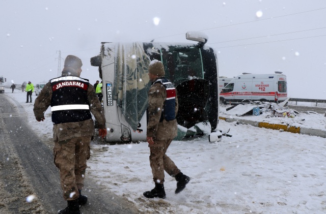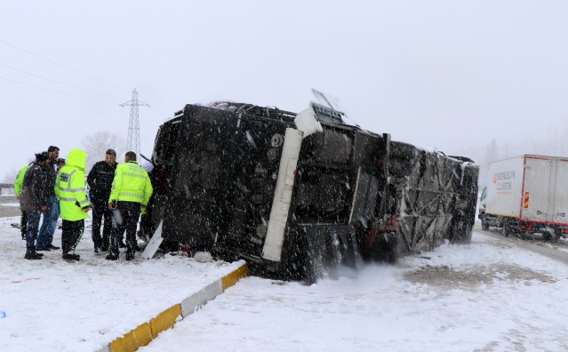 Kar ve tipinin etkili olduğu Erzincan’da buzlanan yolda sürücüsünün kontrolünden çıkan yolcu otobüsü yan yattı. Kazada 46 yolcu, yaralandı.