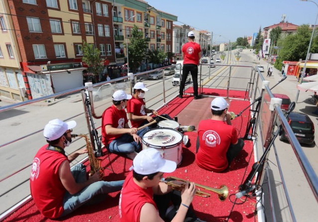 Tepebaşı Belediyesi'nin otobüsü de üzerindeki bando ile birlikte ilçeyi dolaşıyor, marşlar çalınıyor...
