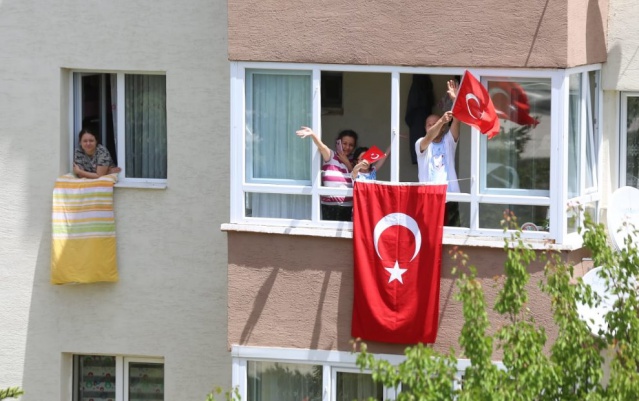 Tepebaşı'nda da vatandaşlar bayraklarlas balkon ve pencerelerine çıkıp marşlara eşlik etti.