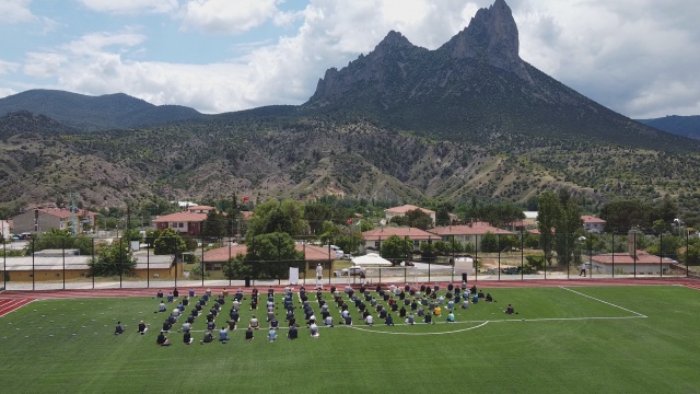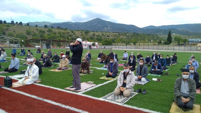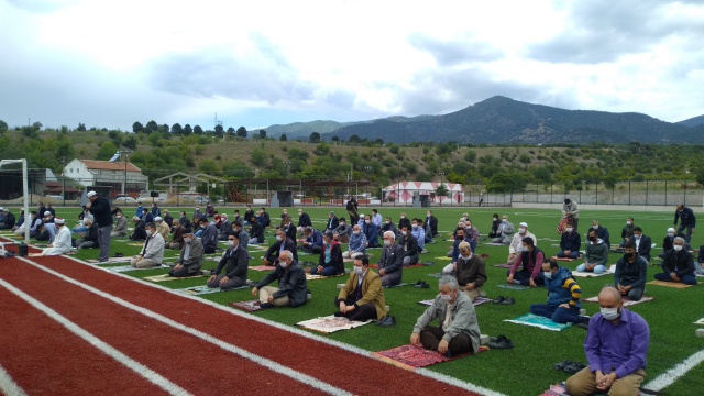 Koronavirüs ile mücadelede alınan önlemler kapsamında 16 Mart'tan itibaren ara verilen cuma namazları, 74 gün sonra bugün Eskişehir’in Sarıcakaya ilçesinde merkezde halı sahalarda, mahallelerde ise cami bahçelerinde kılındı.