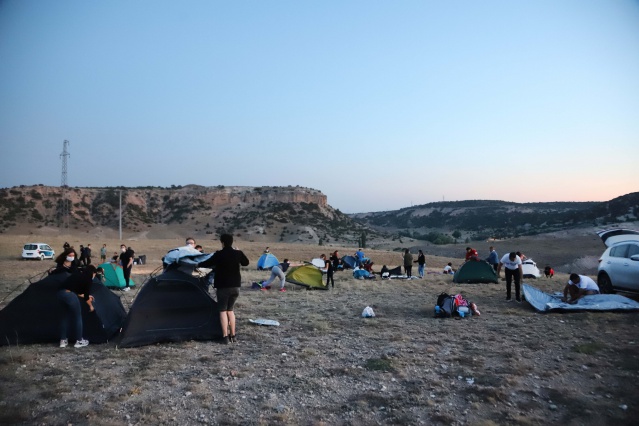 Gözlem noktası olarak seçilen Tepebaşı ilçesinin Yusuflar Mahallesinde sosyal mesafe ve maske kurallarına hassasiyet göstererek bir araya gelen gökyüzü meraklıları, çadır kurarak geceyi gözlem alanında geçirdi.