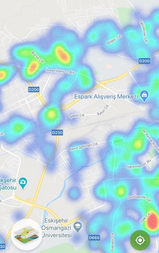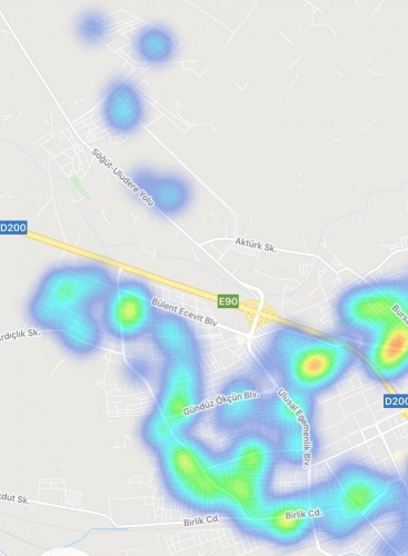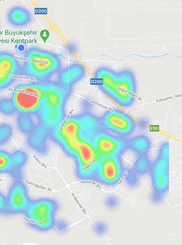 Şahin Caddesi ve Gazi Yakup Satar Caddesi arasında kalan bölgede de yoğunluk görülürken, Halk Caddesi çevresinde de kırmızı bölge olduğu görülüyor.