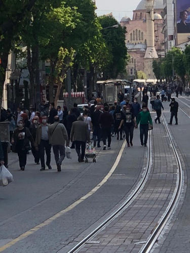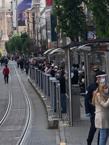 Tramvay duraklarında da kalabalıklar ve yoğunluk oluştu. Sosyal mesafe arka plana atıldı...