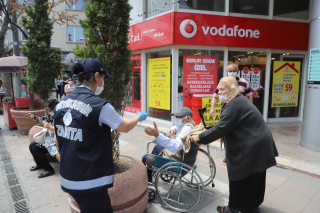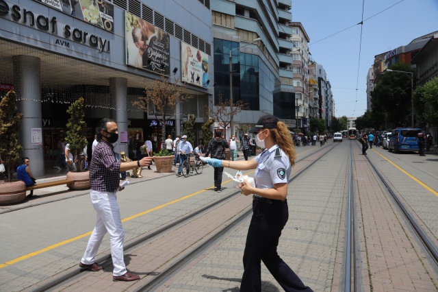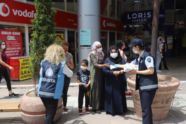 Zabıta ekipleri aracılığı ile yoğunluğun yaşandığı bölgelerde vatandaşlara maske dağıtan Büyükşehir Belediyesi, vatandaşları fiziksel mesafe ve hijyen konusunda da bilinçlendiriyor.