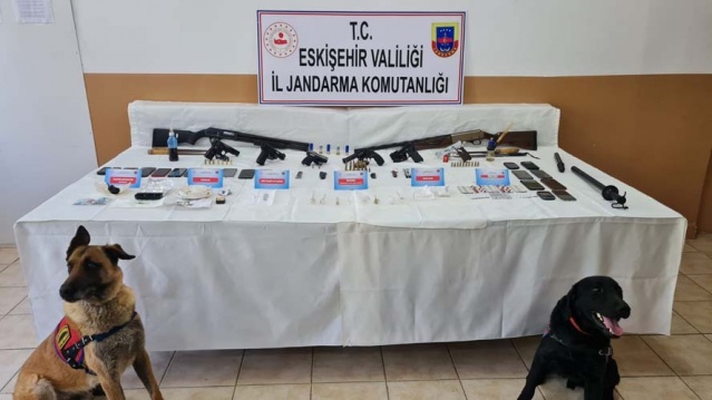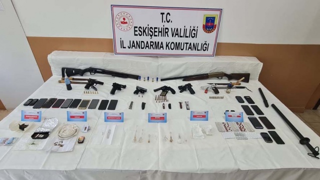 150 Jandarma personeli ve Narkotik Köpek Timleri’nin katılımı ile yapılan aramalarda; 175 gram metamfetamin, 160 gram bonzai, 5 gram kokain, 171 adet sentetik uyuşturucu hap, 7 kök ekili kenevir bitkisi, 3 adet uyuşturucu satışında kullanılan hassas terazi, 33 adet uyuşturucu kullanma aparatı, 3 adet ruhsatsız tabanca, 17 adet 9 mm çapında tabanca mermisi, 3 adet kuru-sıkı tabanca ve bu tabancaya ait 31 adet mermi, 2 adet ruhsatsız av tüfeği ve 5 adet fişek, 4 adet pala, 6 adet sustalı ve kelebek tabir edilen bıçak ile 2 adet jop ve 19 adet cep telefonu ele geçirildi.