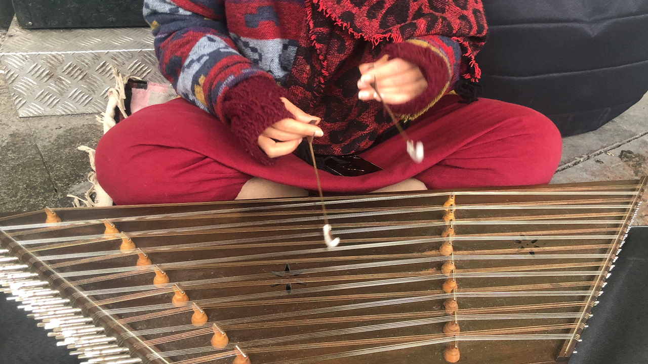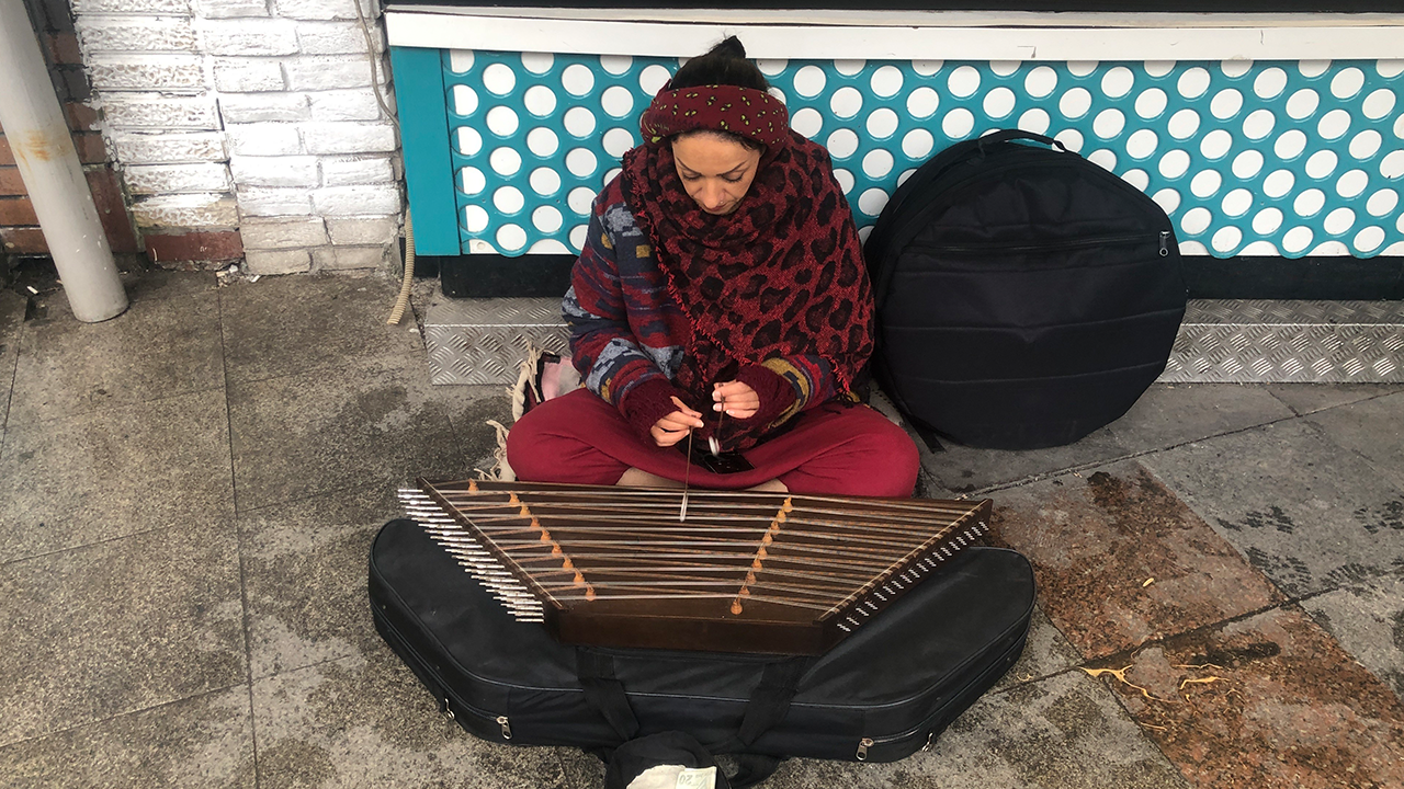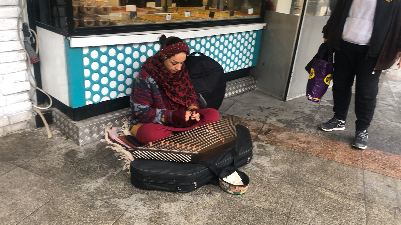 Hindistan kökenli bir çalgı olan santur, yere bağdaş kurularak çalınıyor. Sokak sanatçısı, “zahme” adı verilen tahta çubuklarla tellere belirli tekniklerle vurarak enstrümanı kullanıyor. Ortaya çıkan melodiler, caddeyi adeta açık hava müzik alanına dönüştürüyor.
