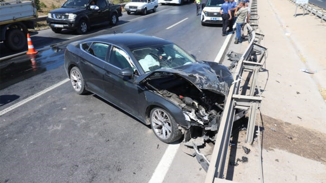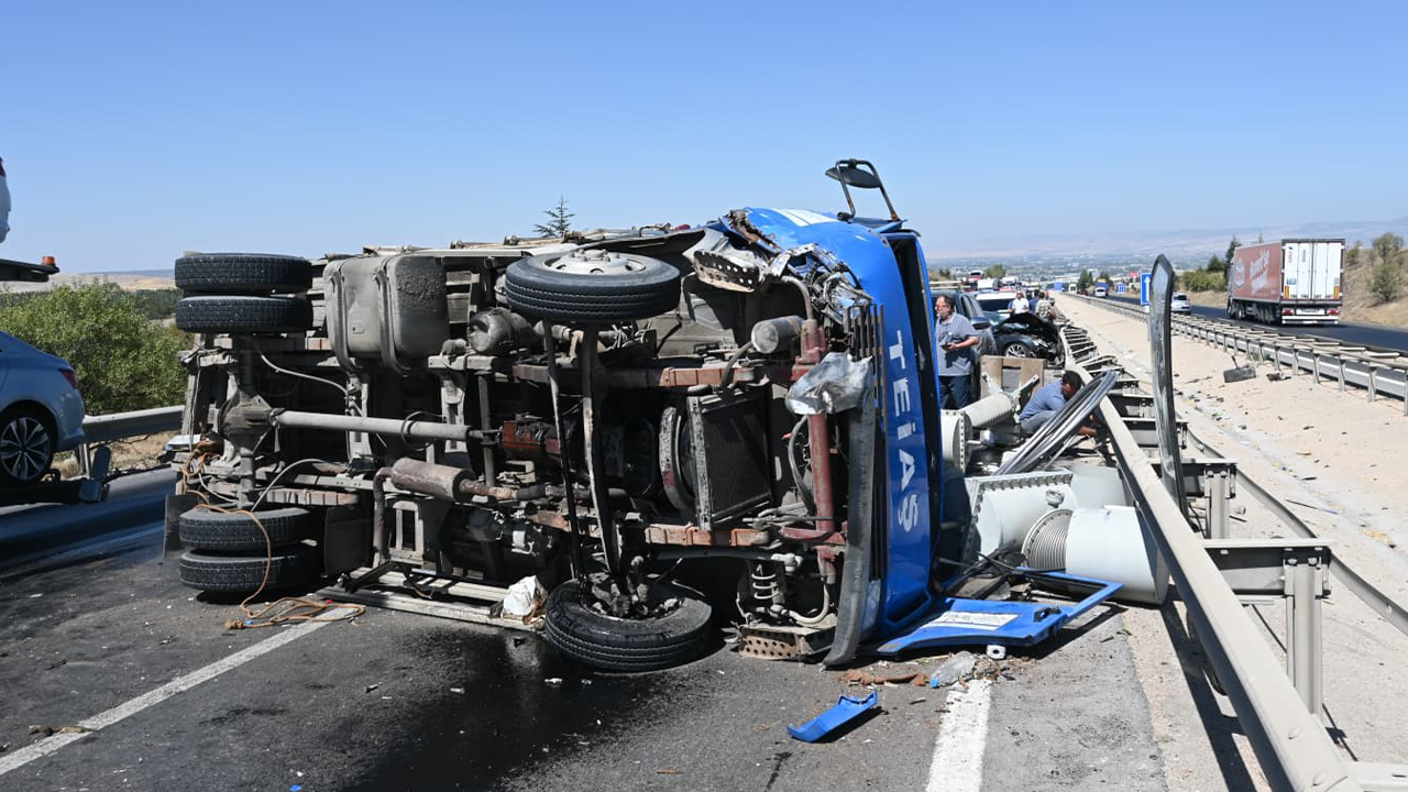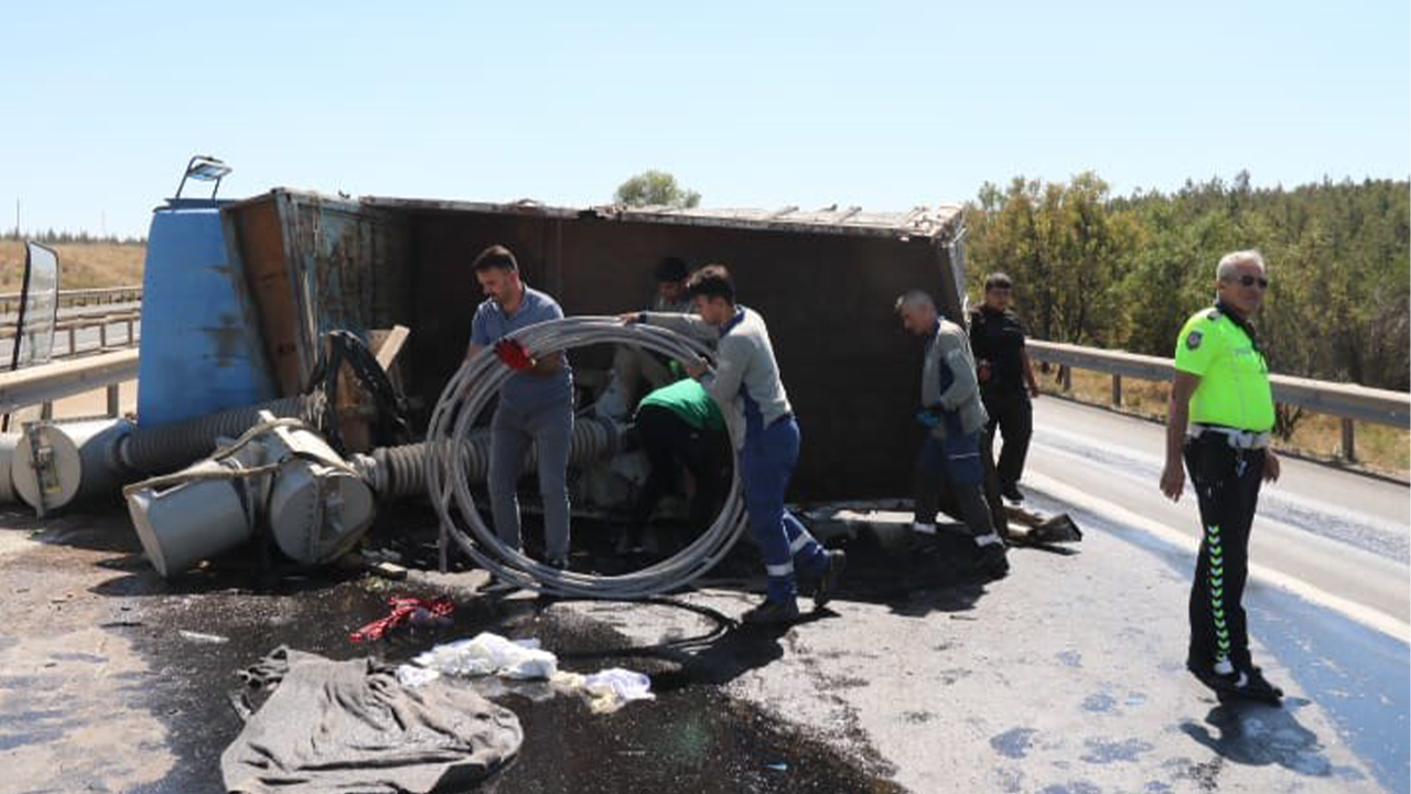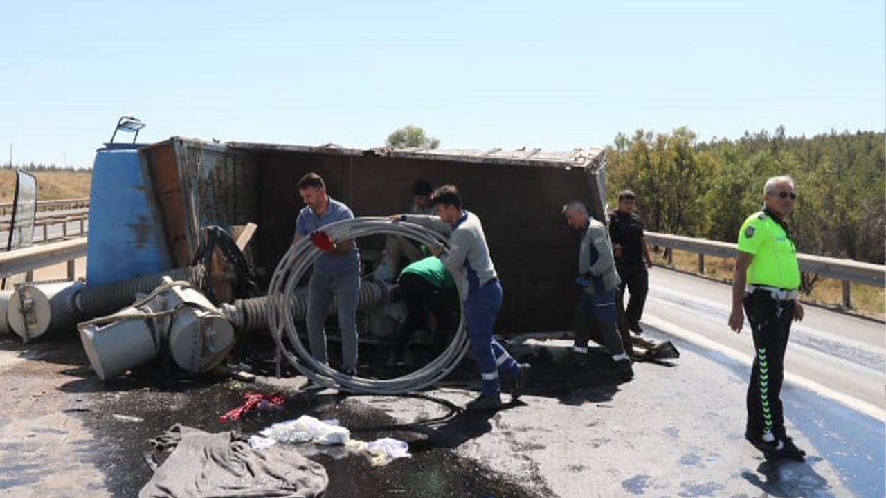 Kamyona çarpan otomobilin sol ön tekerleği yerinden çıkarken, araç orta refüje savruldu. Kaza nedeniyle bölgede uzun süre ulaşım aksarken, devrilen kamyonun kaldırılması ve yolda temizlik çalışmaları için ekipler seferber oldu.