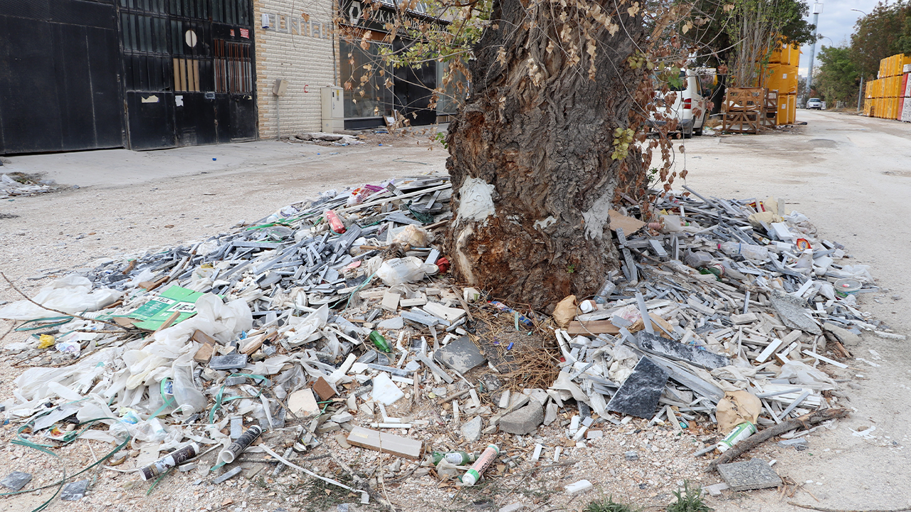 Baksan Sanayi Sitesi’nde mermercilerin yoğun olduğu bölgede, yol kenarındaki bir ağacın çevresi sanayi atıklarıyla doldu. Çevrede oluşan çöp yığınları dikkat çekti.