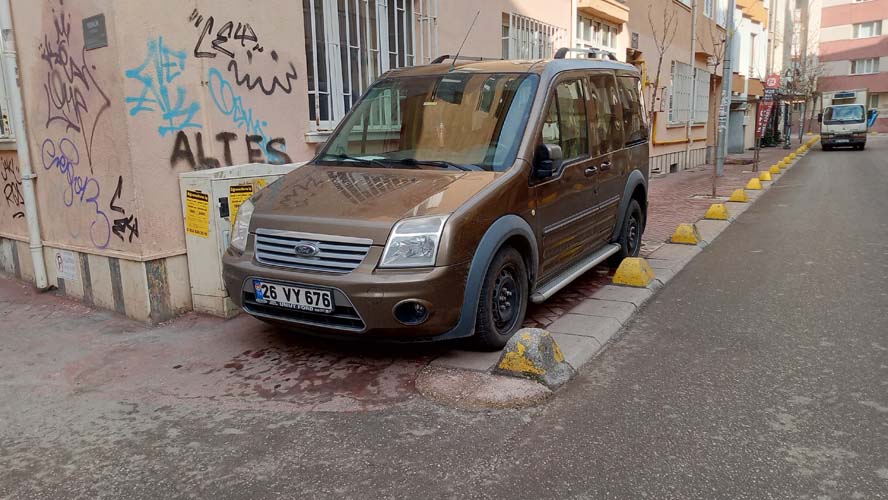 Eskişehir’de dubaların da çare olmadığı kaldırıma çıkarak engelli rampasının önüne park edilen araçlar, yayaların, bisikletlilerin ve bebek arabalarının geçişine engel oluyor.
