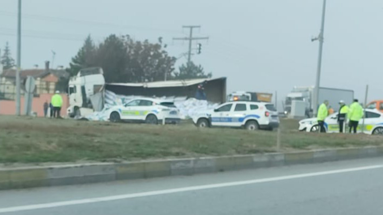 Eskişehir-Bursa karayolunda sürücüsünün kontrolünü kaybettiği tır kavşakta yan yattı. Dorsedeki yükün yola saçılması trafik akışını aksattı.