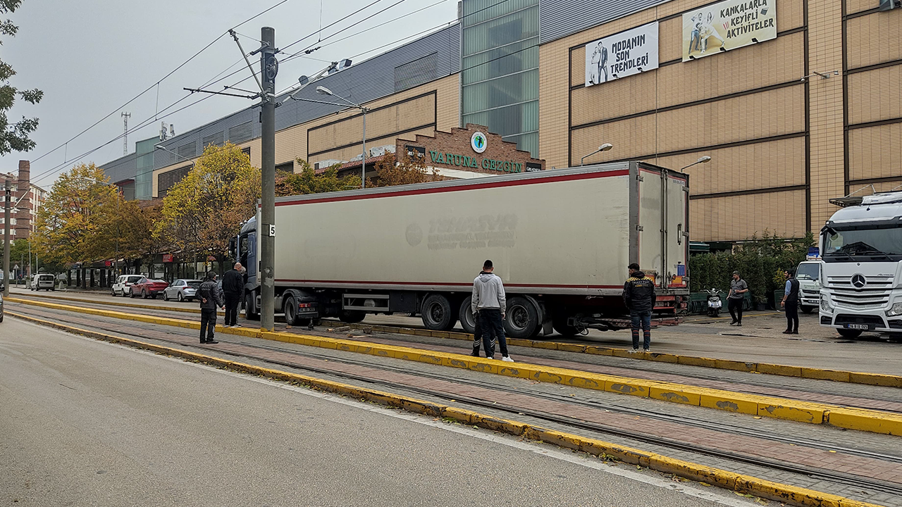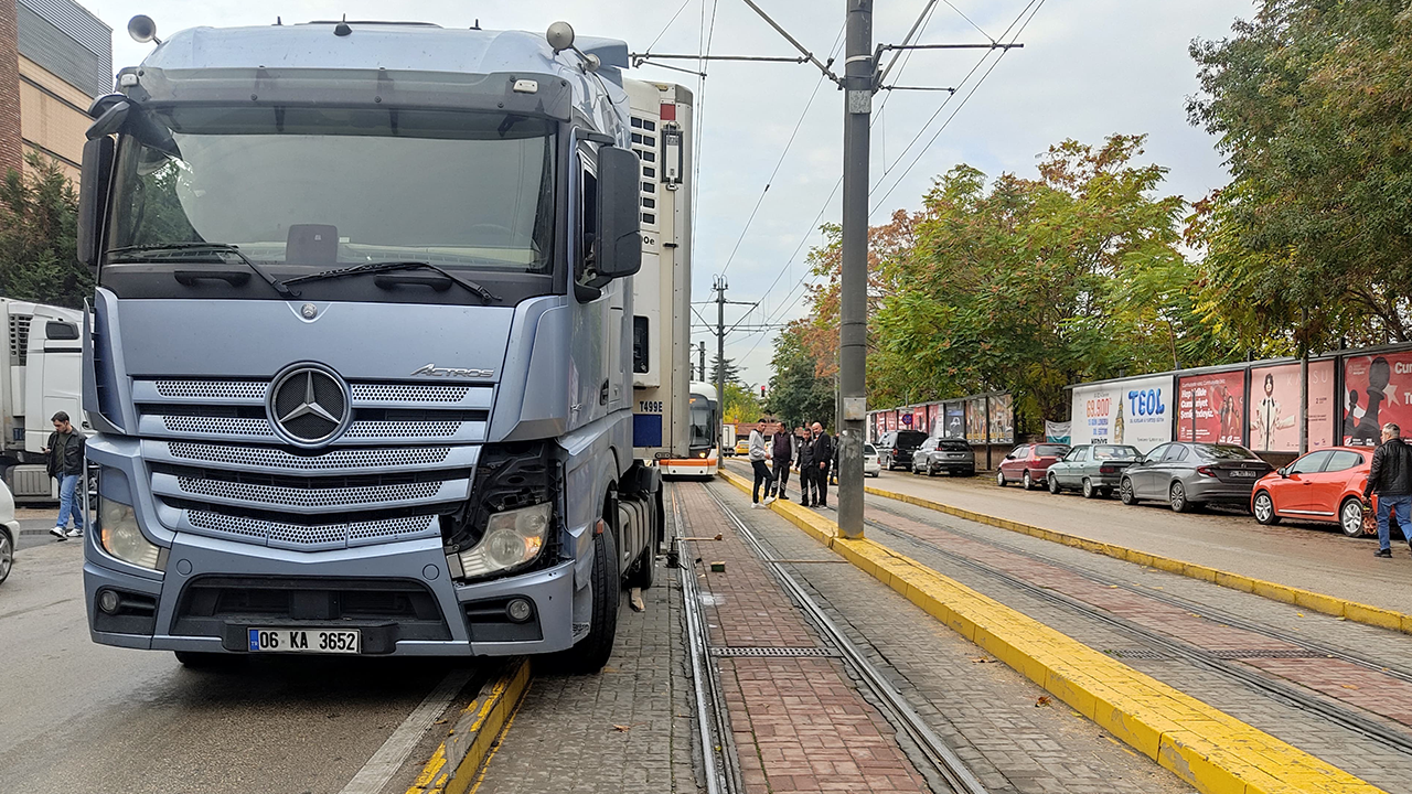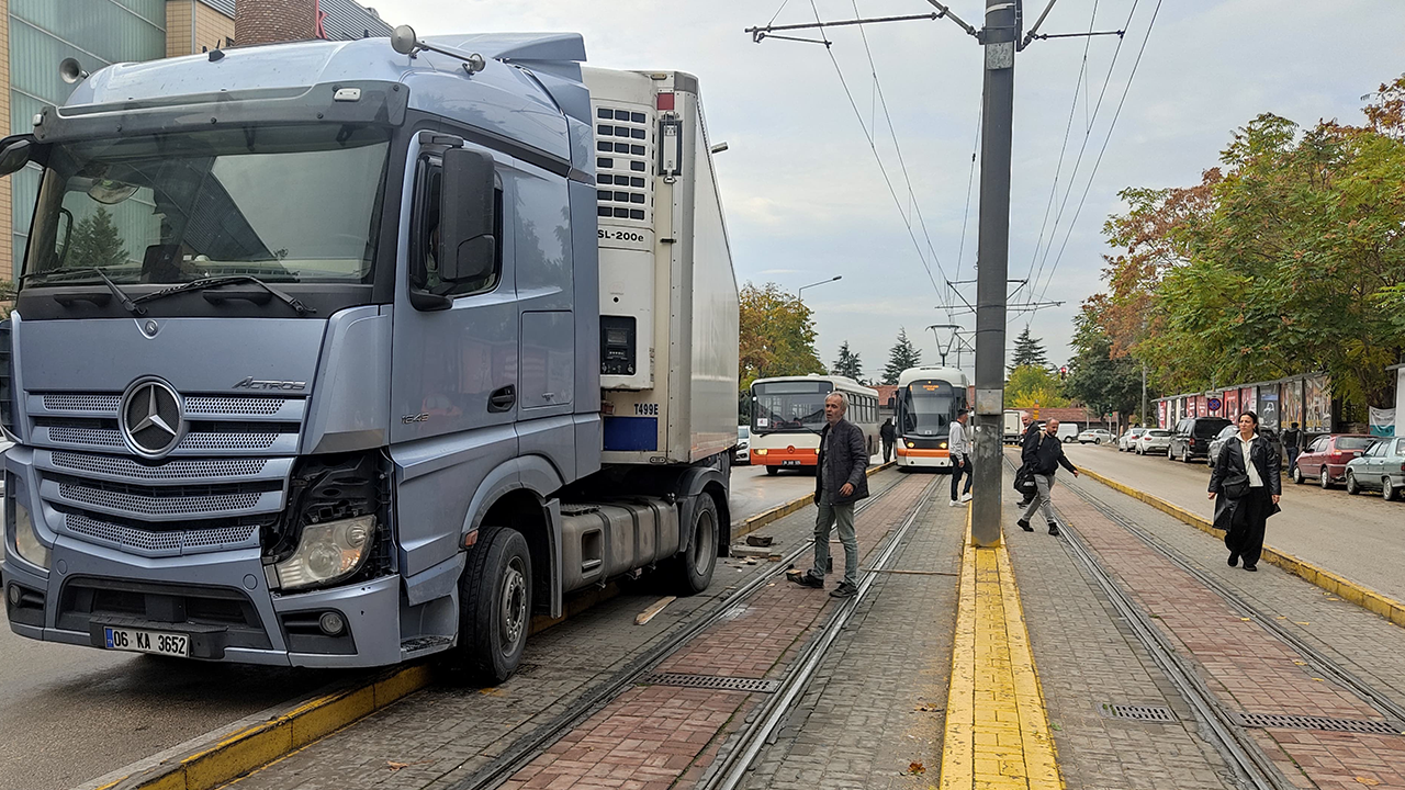 Eskişehir’de sürücüsünün direksiyon hakimiyetini kaybettiği tır tramvay yoluna girdi. Kazada maddi hasar meydana gelirken, tramvay seferlerinde kısa süreli aksama yaşandı.