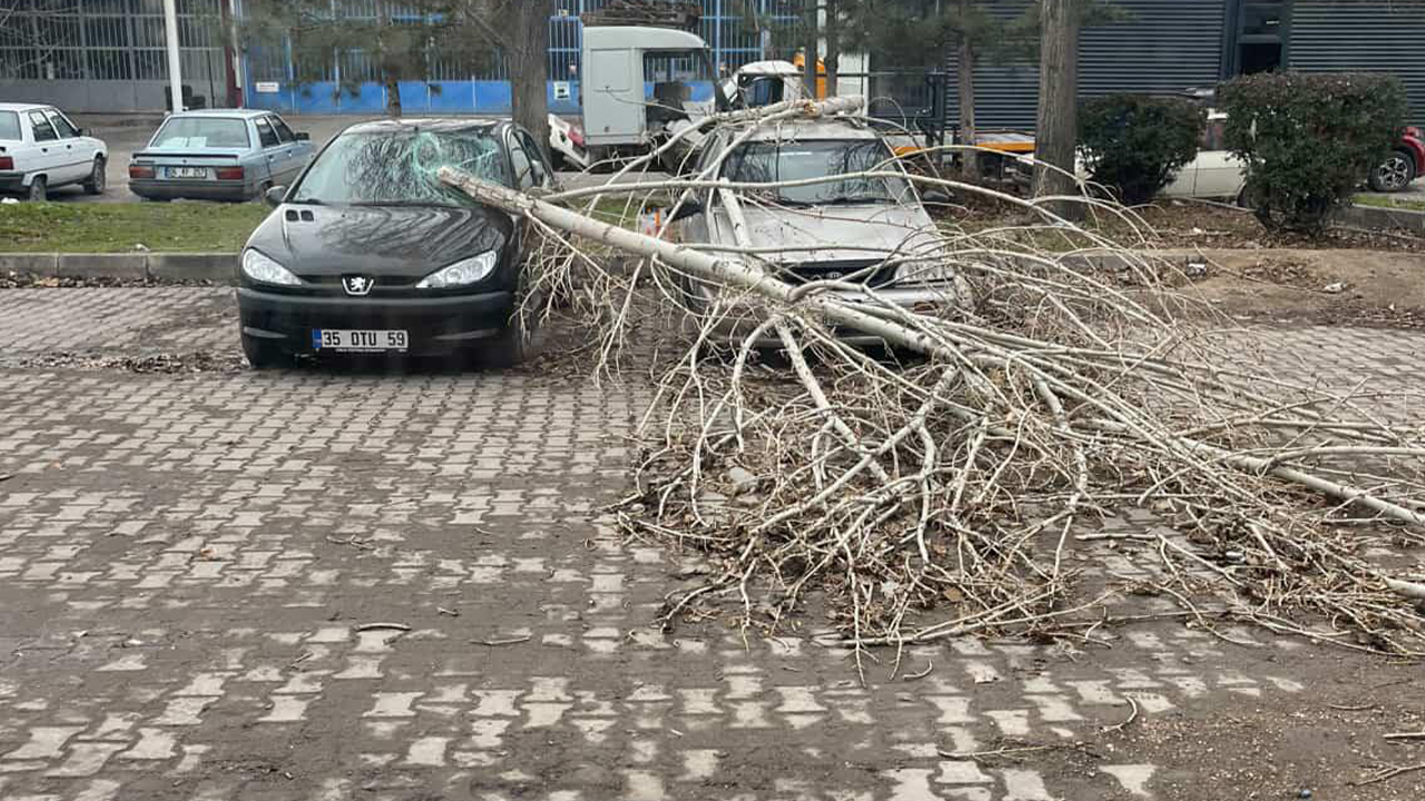 Fırtınanın etkisiyle kökünden sökülen ağaçlar devrildi, park halindeki araçlarda maddi hasar oluştu.