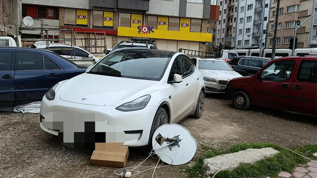 Bir binanın çatısından kopan çanak anten, park halindeki bir aracın üzerine düşerek hasara yol açtı.