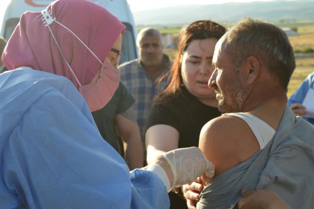 Eskişehir’de tarımın bel kemiği olan mevsimlik işçiler, kaldıkları çadır alanında Korona virüse karşı aşılandı.