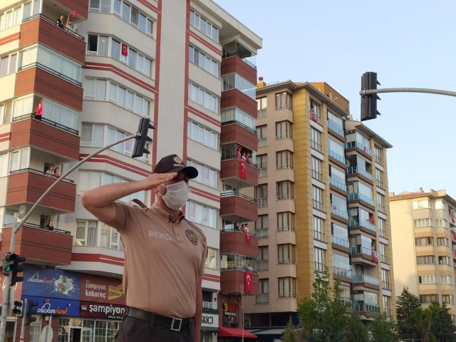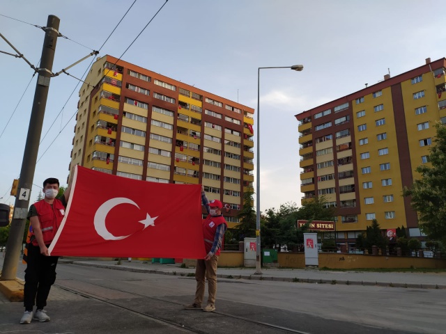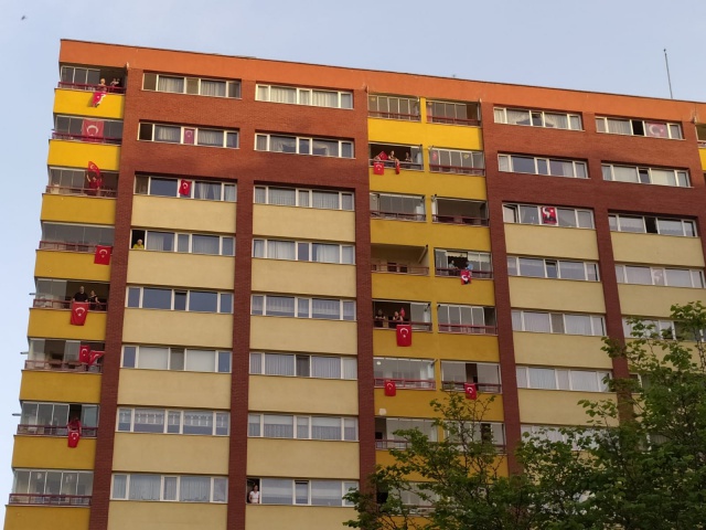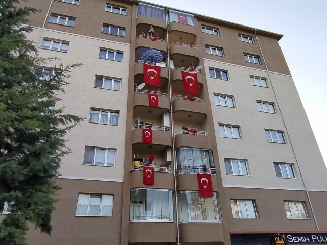 Cumhurbaşkanı Erdoğan’ın çağrısının ardından bugün Eskişehir’de iftar öncesi vatandaşlar, saat 19.00 itibarıyla evlerinin balkonlarına ve pencerelerine çıkarak ellerindeki Türk bayraklarını dalgalandırmaya başladı.