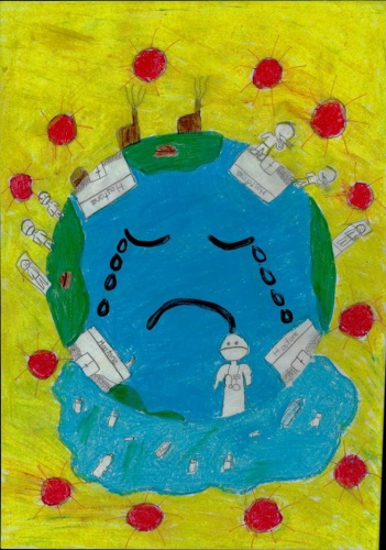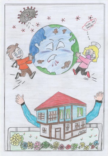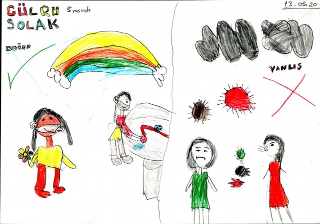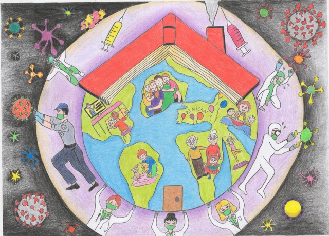 Koronavirüs görüntülerini de resimlerinde sıkça kullanan çocuklar, resimlerinde anlamlı mesajlar verdi.