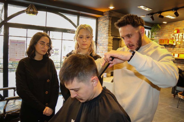 Eskişehirli saç tasarımcısı Hasan Yılmaz, işletmesinde stajyer olarak çalıştırdığı 2 kadına erkek kuaförlüğünü öğretiyor.